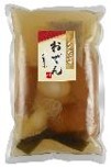 大根(国産)、こんにゃく、おでん用調味液(食塩、ぶどう糖果糖液糖、醤油、その他)、ゆで卵、海老真丈、ごぼう巻、魚真丈、しらたき、昆布/加工でん粉、水酸化Ca、調味料(アミノ酸等)、(一部にえび・小麦・卵・大豆・やまいもを含む)