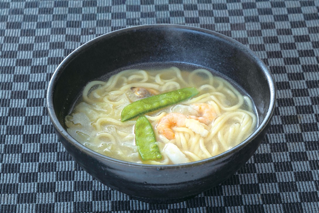 長崎県産の鯛のアラから抽出したエキスを使用した、コクとうま味が自慢のスープです。エビ、イカ、アサリの3種類のシーフードを贅沢に入れ、国産のキャベツと紅白蒲鉾、キヌサヤを混ぜ合わせ彩りよく仕上げました。麺はブレンドした小麦粉を使用し、ソフトな食感の中にもコシが感じられます。