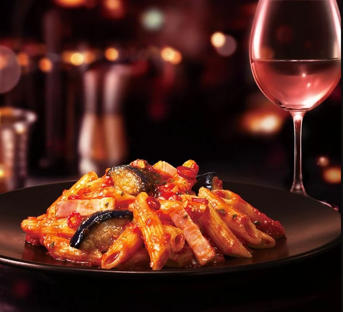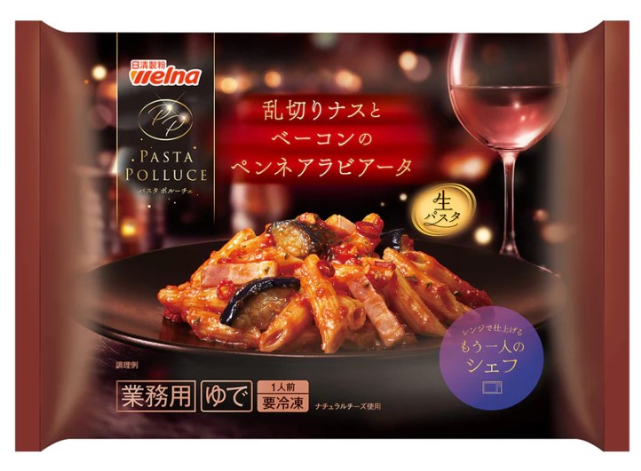 マカロニ(小麦粉、植物性たん白)(国内製造)、トマト・ジュースづけ、トマトペースト、揚げなす、玉ねぎ、ベーコン、植物油脂、チーズ、ショートニング、にんにくペースト、フライガーリック、食塩、香味油、砂糖、香辛料、ミルポワ、チキンコンソメ/加工でん粉、増粘剤(加工でん粉、増粘多糖類)、調味料(アミノ酸等)、アルギン酸エステル、リン酸塩(Na)、乳化剤、着色料(パプリカ色素)、発色剤(亜硝酸Na)、くん液、(一部に小麦・卵・乳成分・大豆・鶏肉・豚肉を含む)