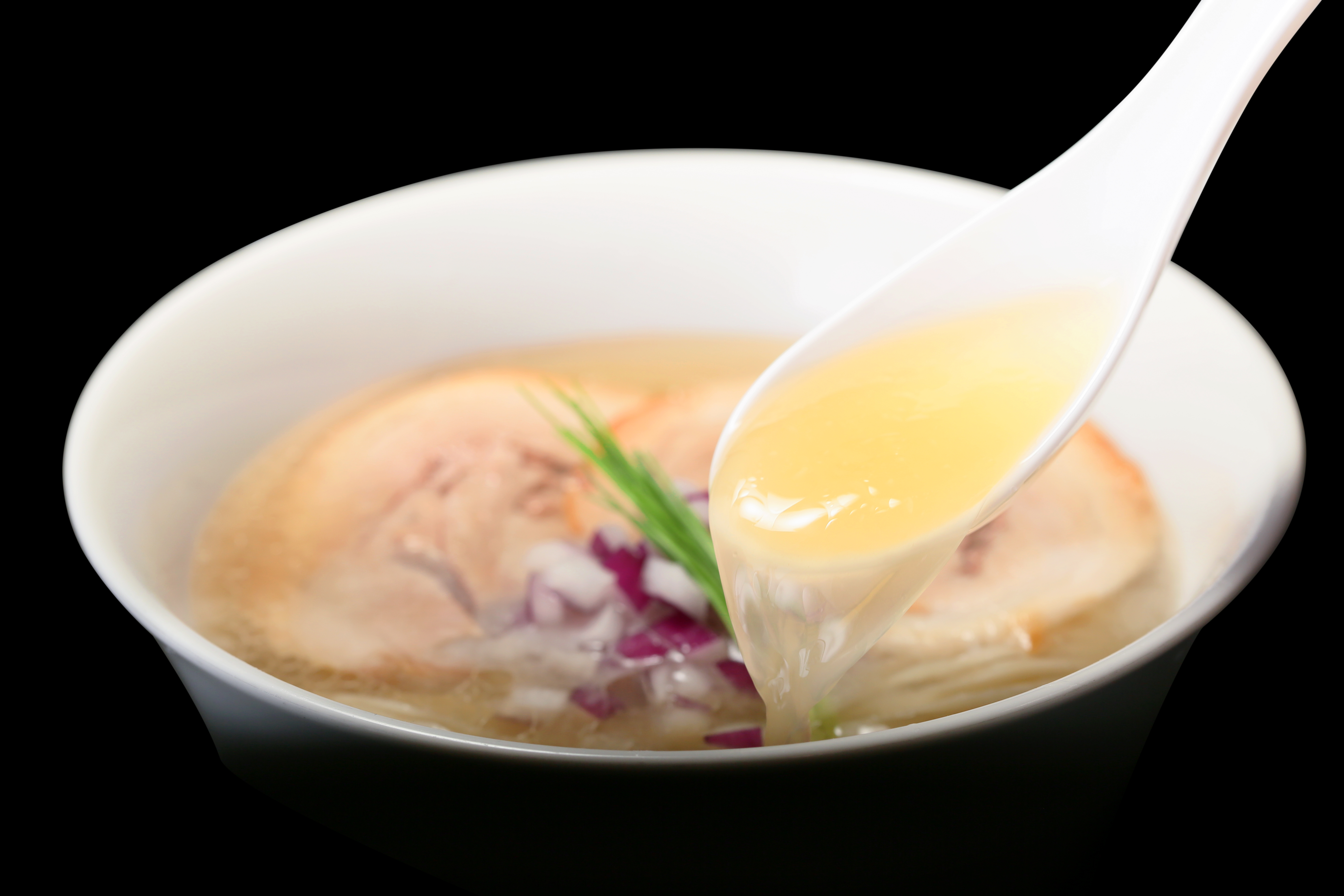 【鍋の準備】鍋を2つ用意。麵用は約2~3L、スープ湯煎用はスープパックが浸かる程度の水を用意。【チャーシュー、スープの湯煎】スープ用鍋が沸騰したらスープパックとチャーシュー袋を入れて湯煎開始。(湯煎時間:スープ約8分、チャーシュー約30秒~1分)【麺の茹で】麺用鍋が沸騰したら、冷凍麺を入れて約2分30秒~3分茹でる。冷凍麺はすぐにほぐすと割れやすいため、少しおいてからさいばしで丁寧にほぐす。【盛り付け】ゆであがった麺をざるで湯切りし、器に盛る。湯煎したスープを注ぎ、次にチャーシューを乗せる。お好みのトッピングを加えて完成。